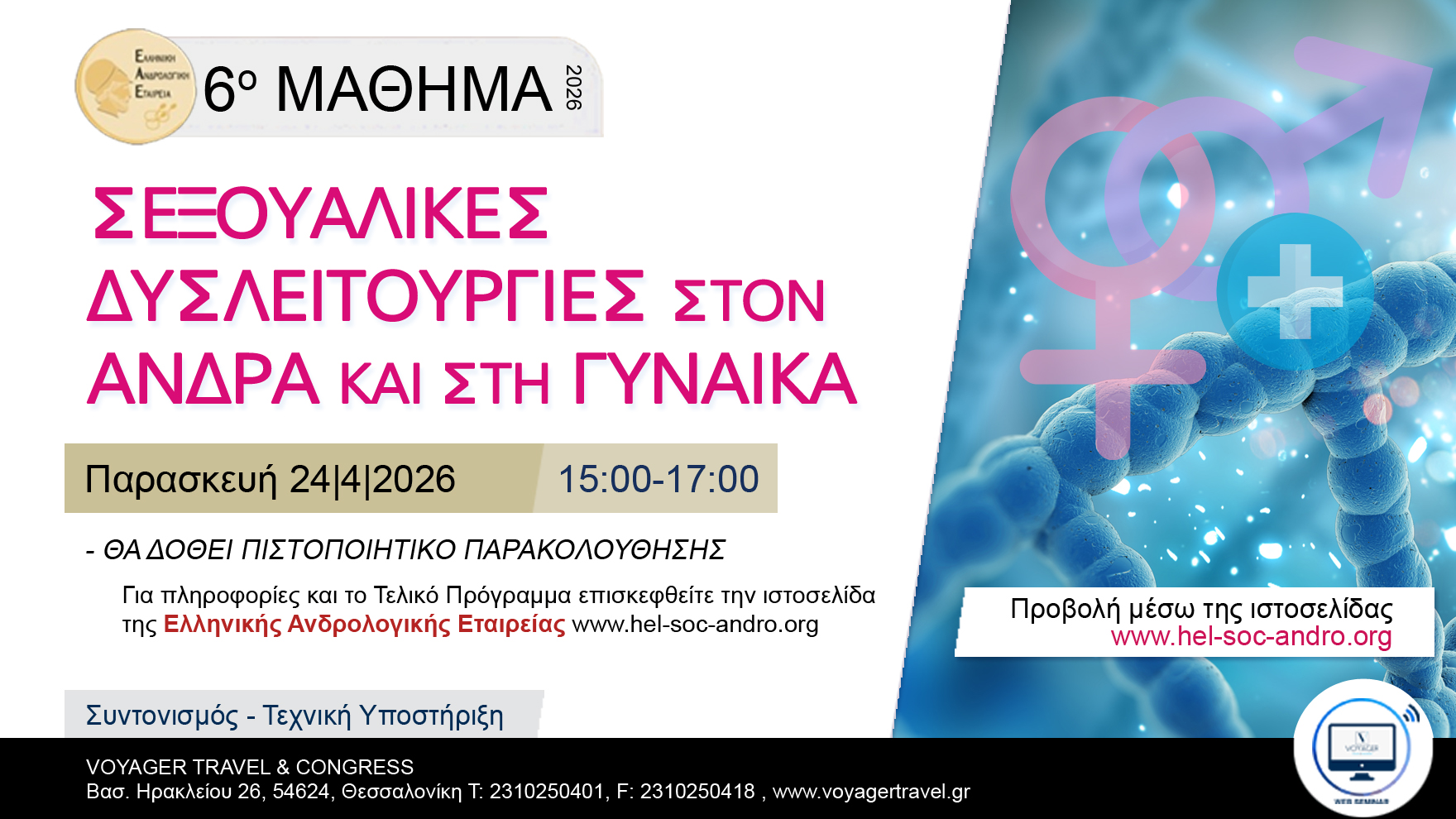 Το 6 Μάθημα της Ελληνικής Ανδρολογικής Εταιρείας με τίτλο «ΣΕΞΟΥΑΛΙΚΕΣ ΔΥΣΛΕΙΤΟΥΡΓΙΕΣ ΣΤΟΝ ΑΝΔΡΑ ΚΑΙ ΣΤΗ ΓΥΝΑΙΚΑ» θα πραγματοποιηθεί διαδικτυακά την Παρασκευή 24 Απριλίου 2026 (Ώρα: 15:00-17:00)